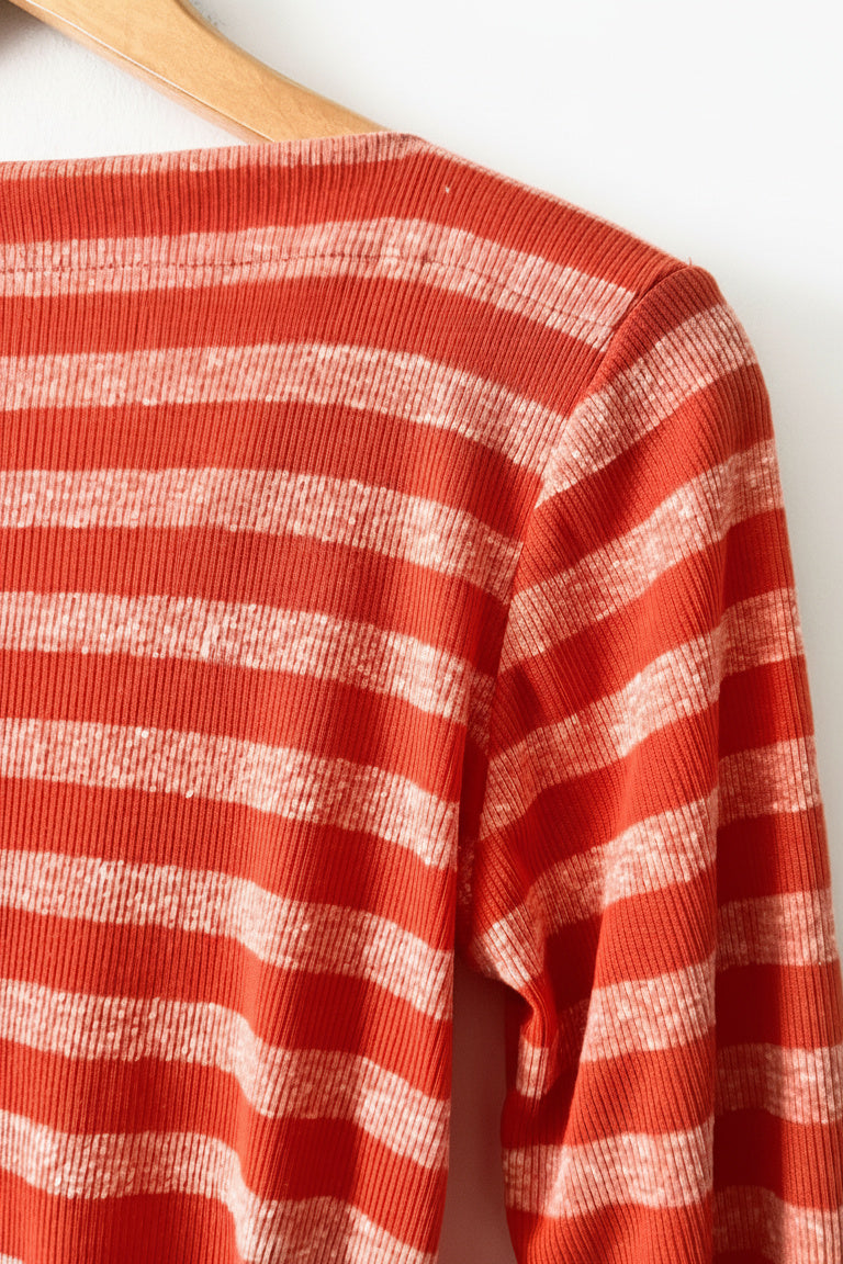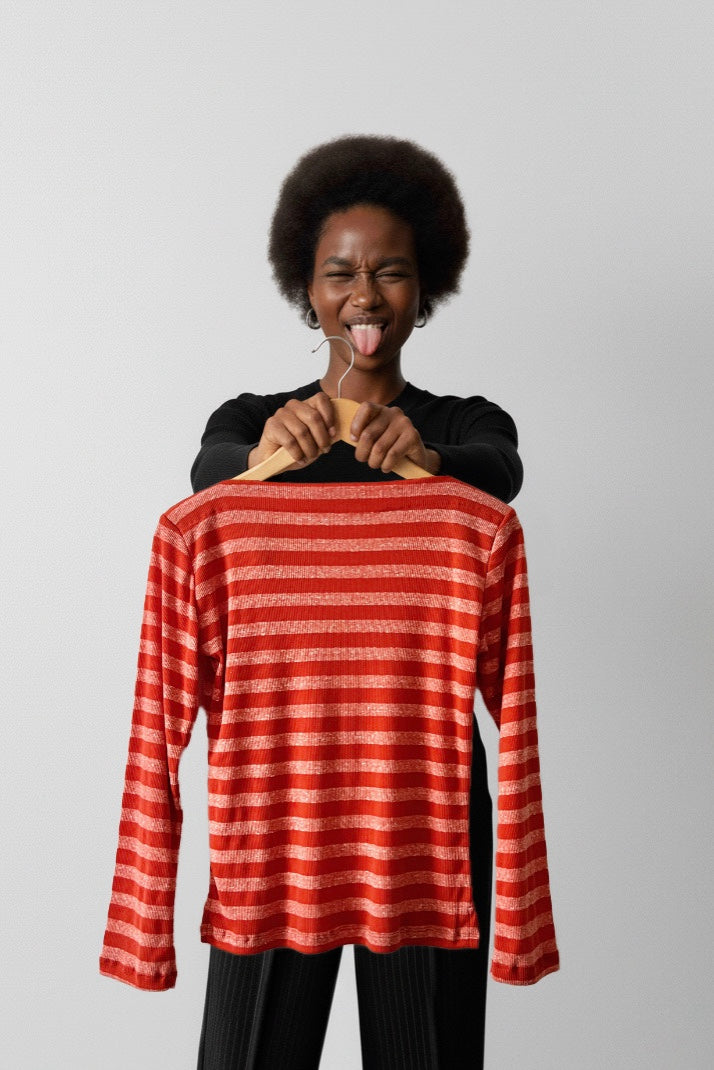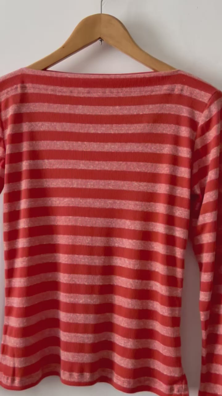 Porque cuando algo funciona se debe repetir . Este modelo ya lo has visto en la versión de verano pero es que este tejido de rayas en tonos rojizos, anaranjados y rosados… es muy bonito. y con este patrón es ideal porque el cuello barco es siempre favorecedor. Es un modelo sencillo pero que tiene su toque sin lugar a dudas.