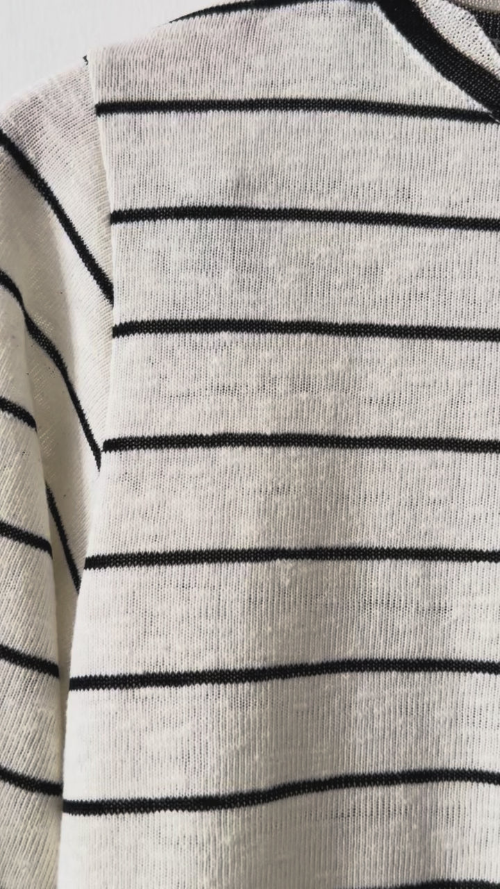 Está confeccionada en un tejido de algodón jaspeado a rayas blancas y negras y esto significa que los hilos combinan tonos claros y oscuros, creando un efecto ligeramente moteado y con textura natural